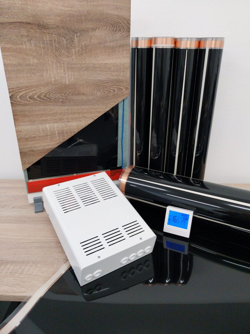 Napon iz mreže (230V) pretvara se u niski napon (12V-48V) koji je totalno siguran za ljude, te se prenosi na grijaće trake ili folije gdje zbog prolaska struje dolazi do stvaranja topline. Grijaće trake ili folije se postavljaju ispod košuljice ili na košuljicu , zavisno od tog koja će biti završna podna oblog, laminat, parket, vinil ili keramika.